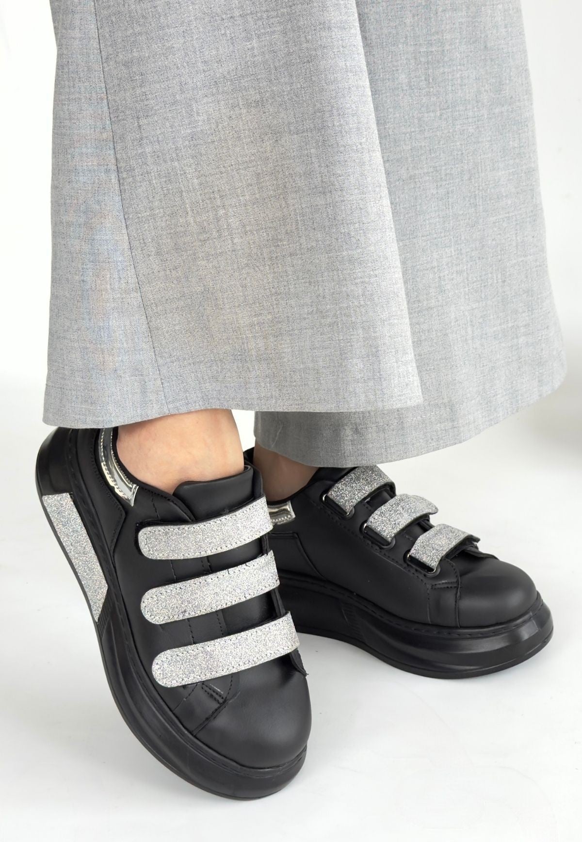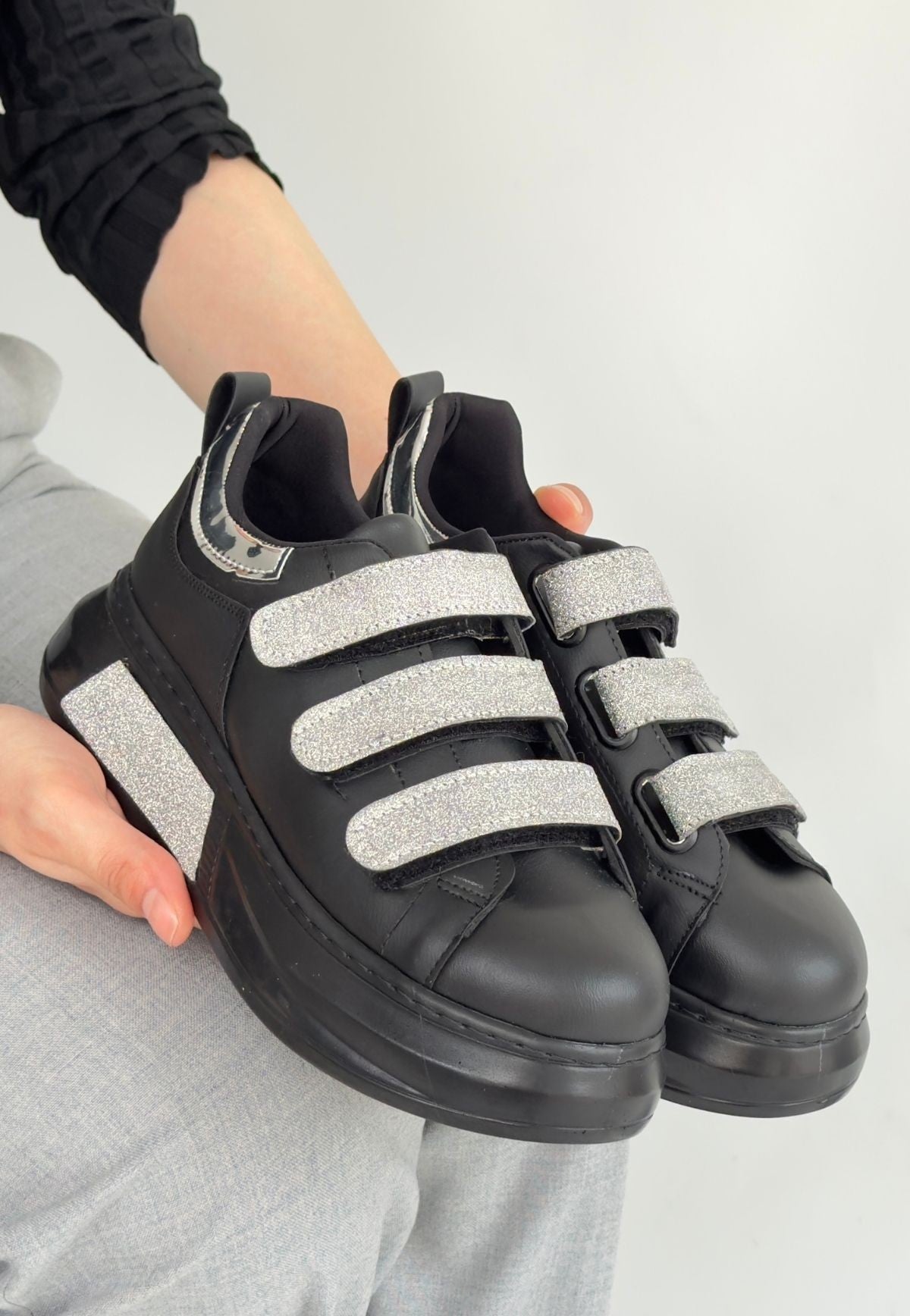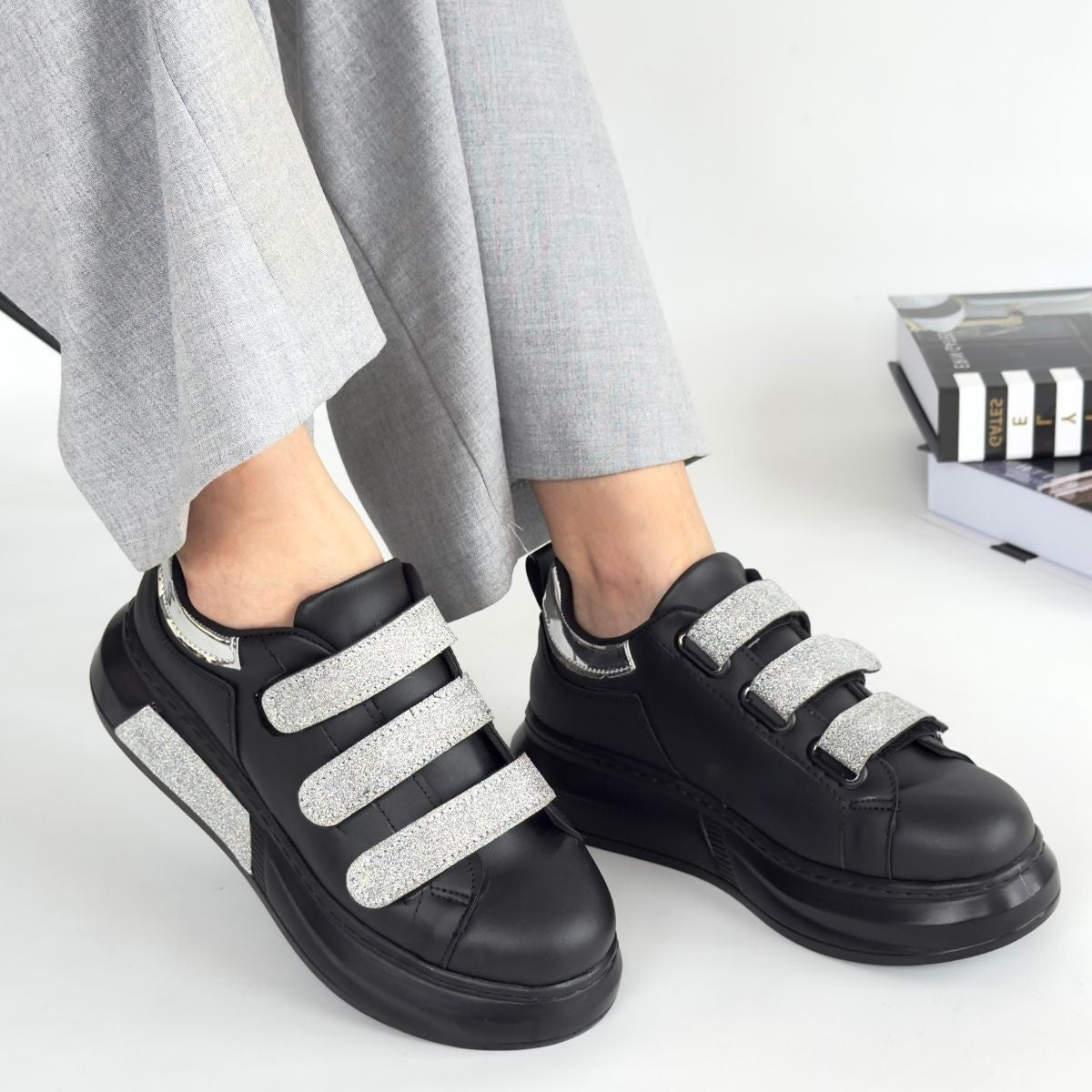 SCARPAX Elika Siyah Simli Cırt Cırt Spor Ayakkabı, hem şıklığı hem de konforuyla günlük stilize mükemmel bir dokunuş katıyor. Bu spor ayakkabıları, şık siyah rengi ve simli detaylarıyla dikkat çekiyor. Zarif tasarımı, her türlü kıyafetle uyumu sağlarken, kalite ve performansı bir arada sunuyor.