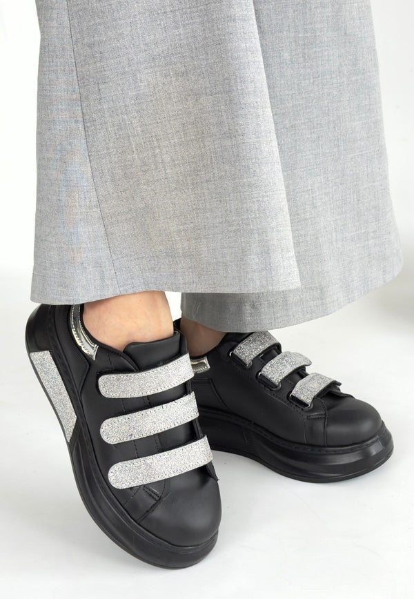 SCARPAX Elika Siyah Simli Cırt Cırt Spor Ayakkabı, 4 cm Dolgu Topuk, Rahat Taban
