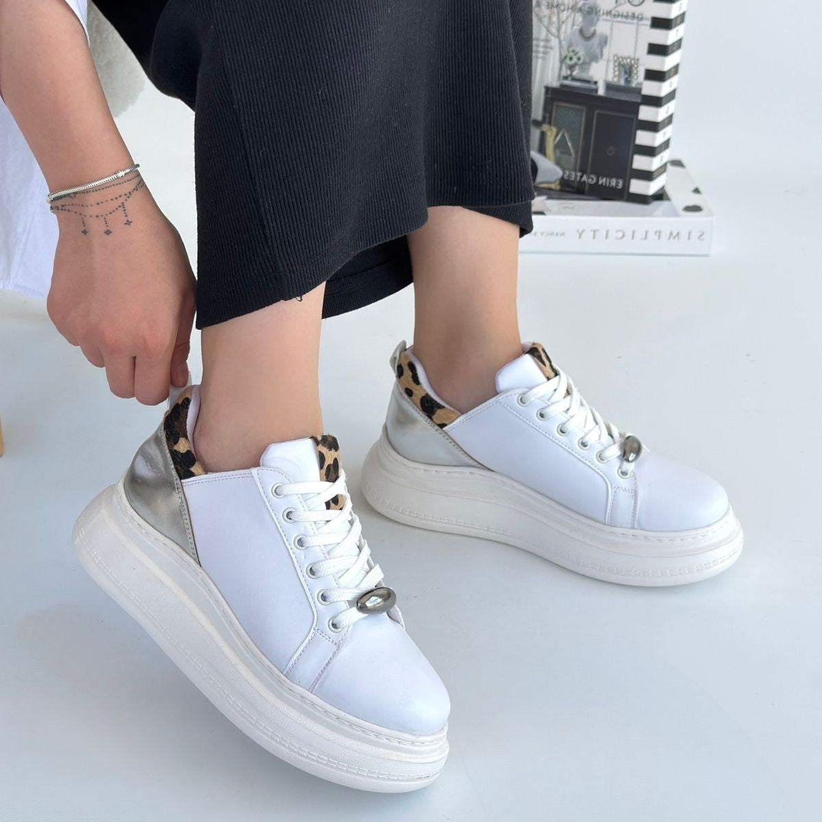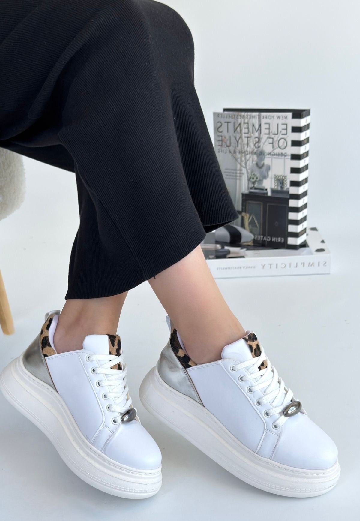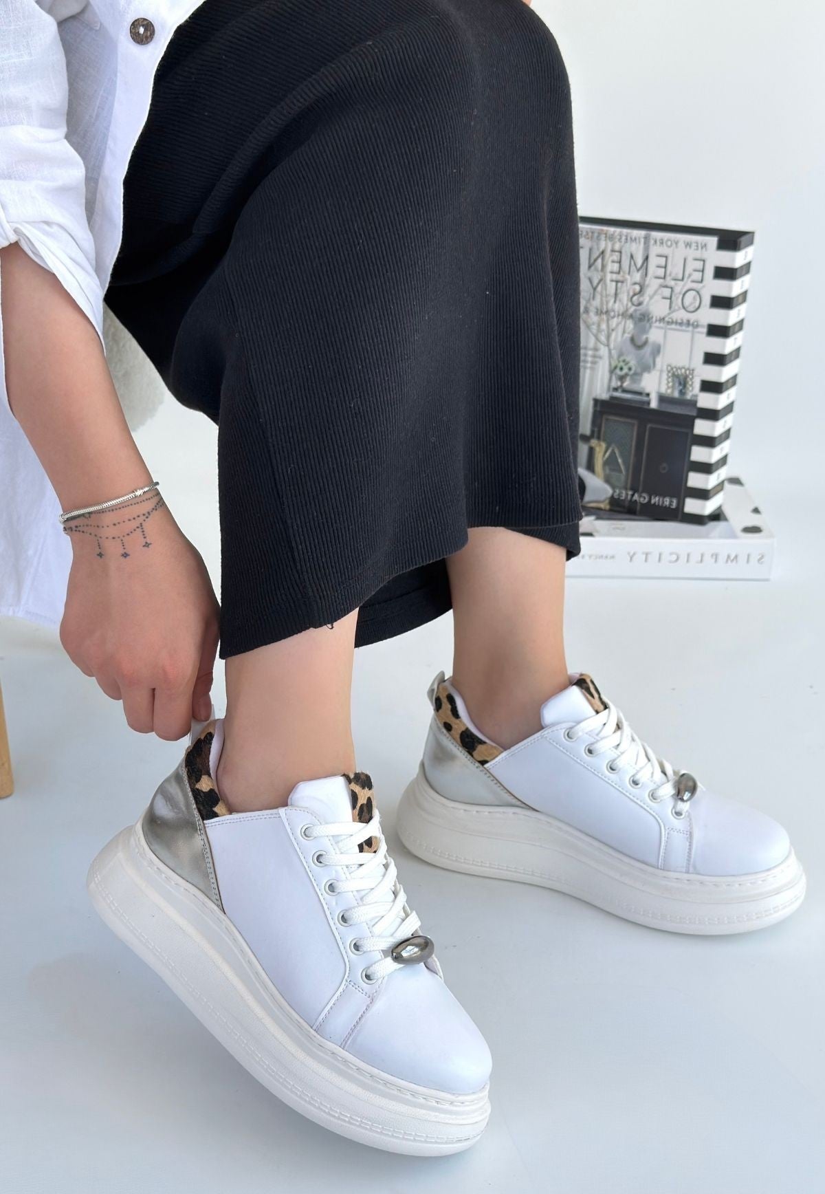 Scarpax Gasta Beyaz Cilt Spor Ayakkabı - Leopar Detaylı, 4 Cm Topuklu, Ortapedik