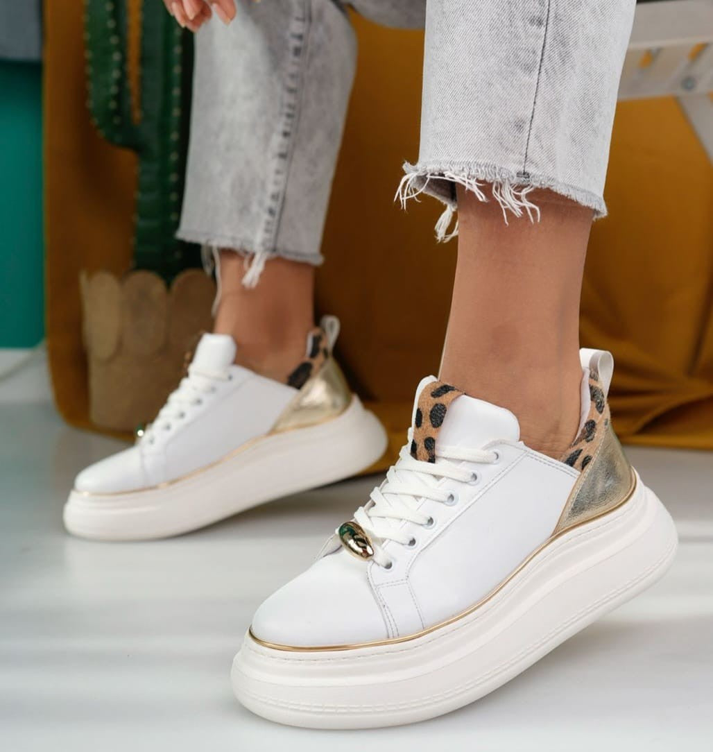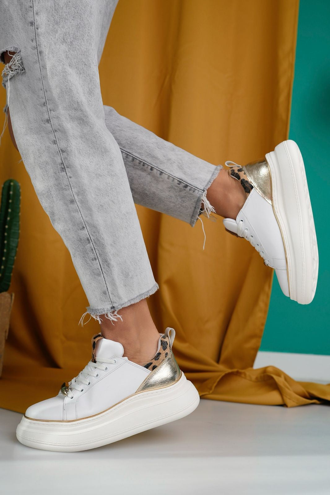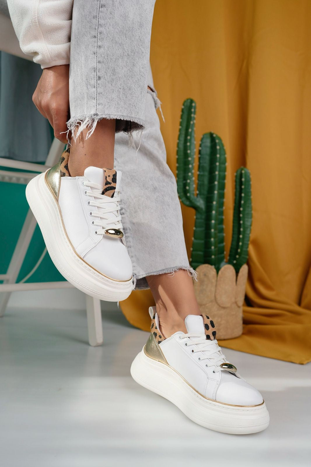 Scarpax Jista Beyaz Cilt Spor Ayakkabı - Leopar Detaylı Ortapedik 4 Cm Topuklu
