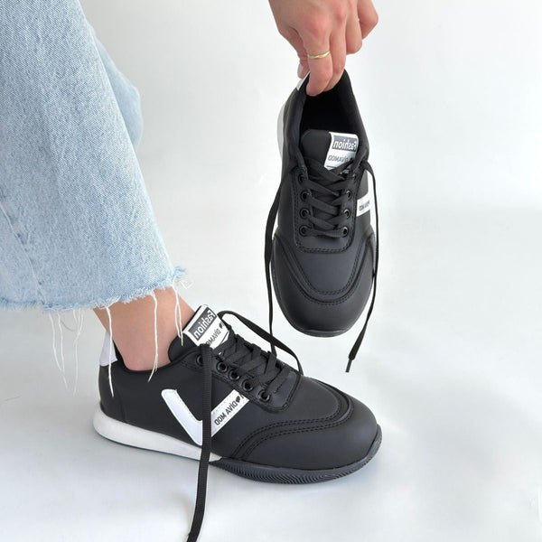 Scarpax Jowen Siyah Cilt Beyaz Detaylı Bağcıklı Spor Ayakkabı