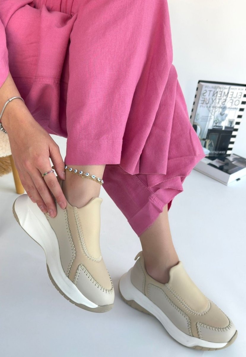 Günlük stilinize şıklık katacak ve rahatlık sunacak bu bej cilt spor ayakkabıyı hemen deneyin. Sizi bekleyen gecikme!