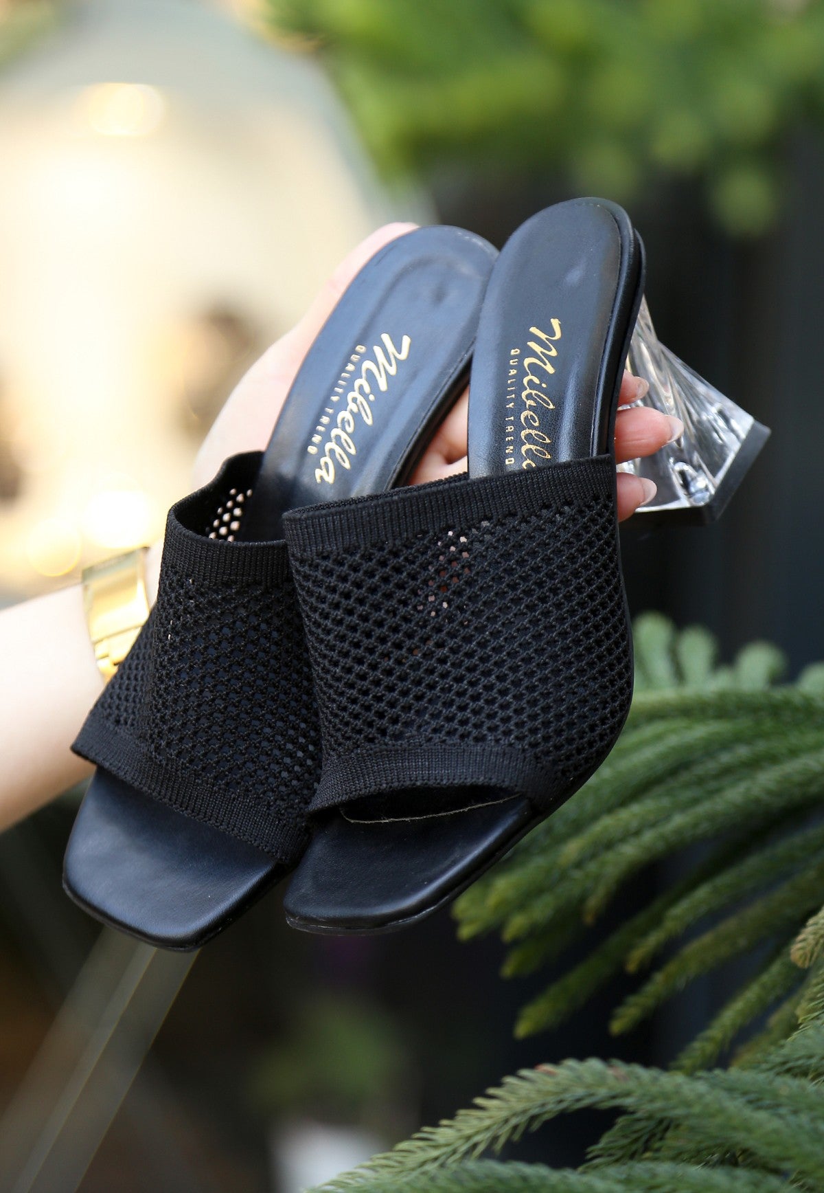 Scarpax Akva Siyah Triko Şeffaf Topuklu Terlik - 8 cm Yükseklik ve Konforlu Tasarım
