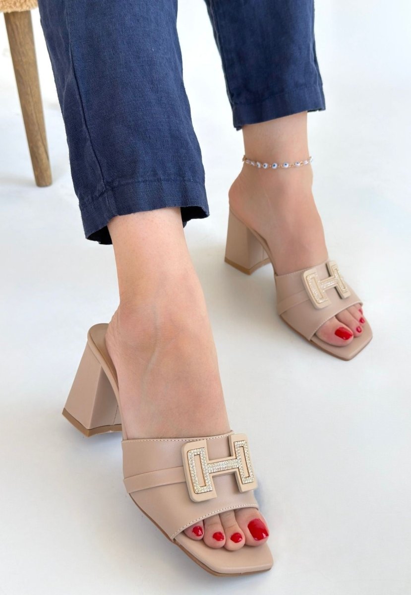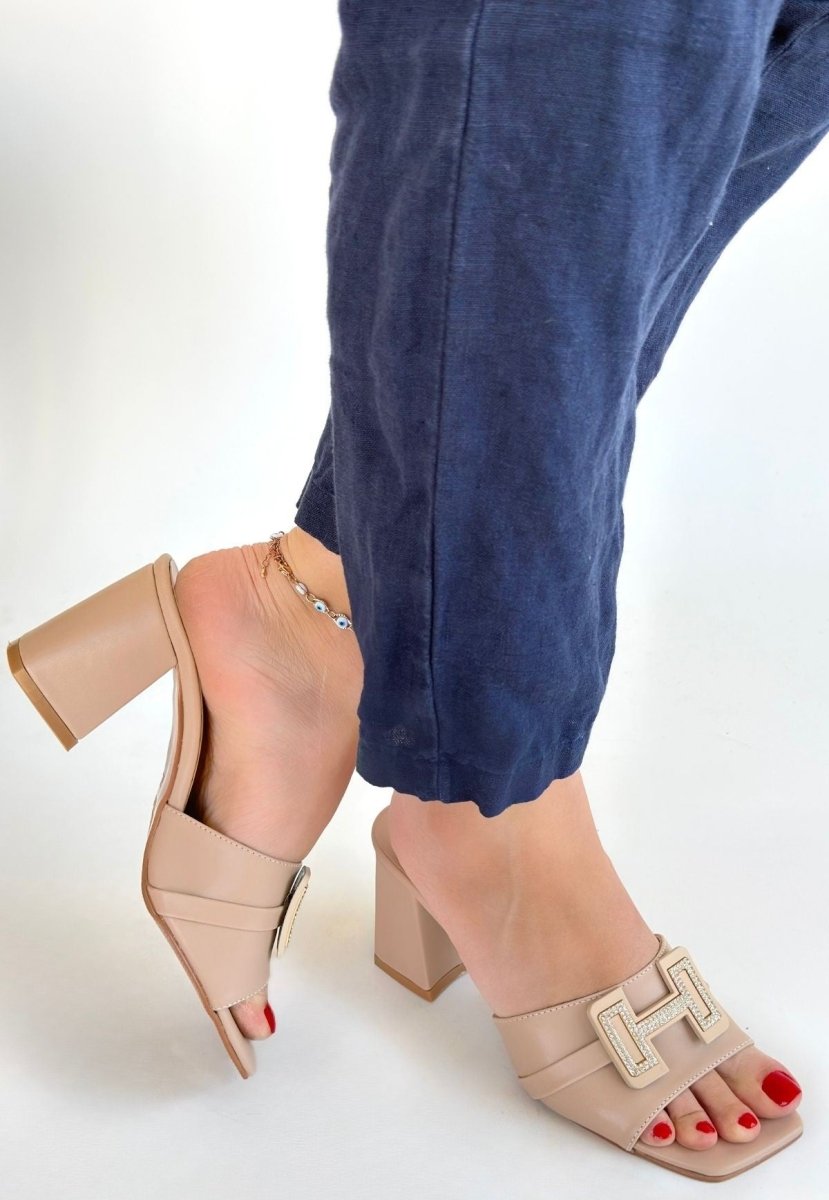 Scarpax Bej Renk Cilt Topuklu Terlik - 7 Cm Topuk Boyu, Standart Kalıp