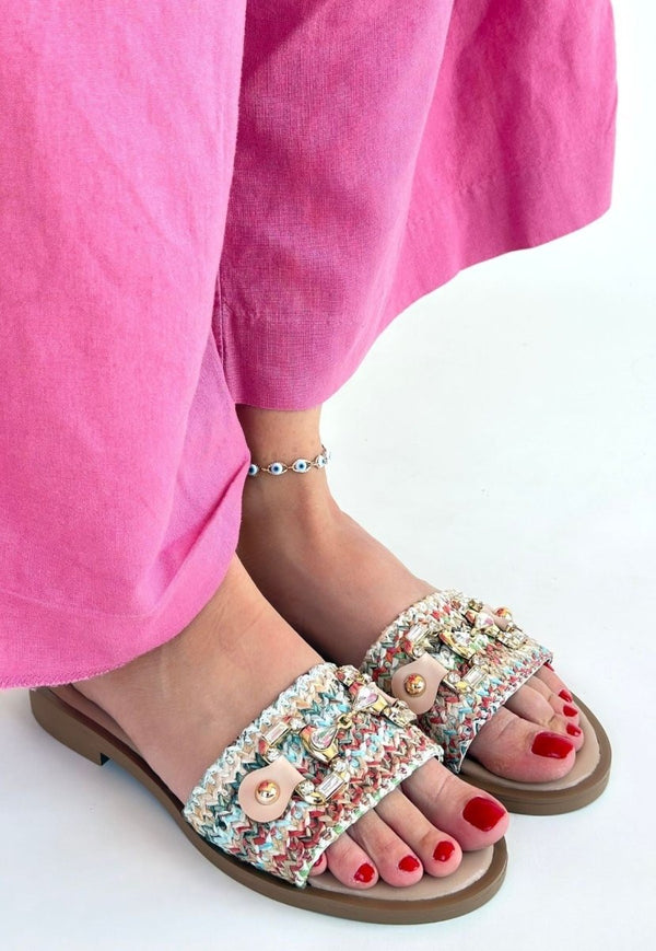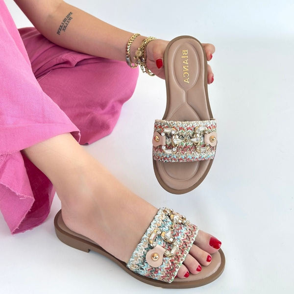 Scarpax Renkli Hasır Dokuma Terlik - Tokalı, Tekstil, 1 cm Topuk