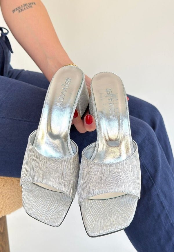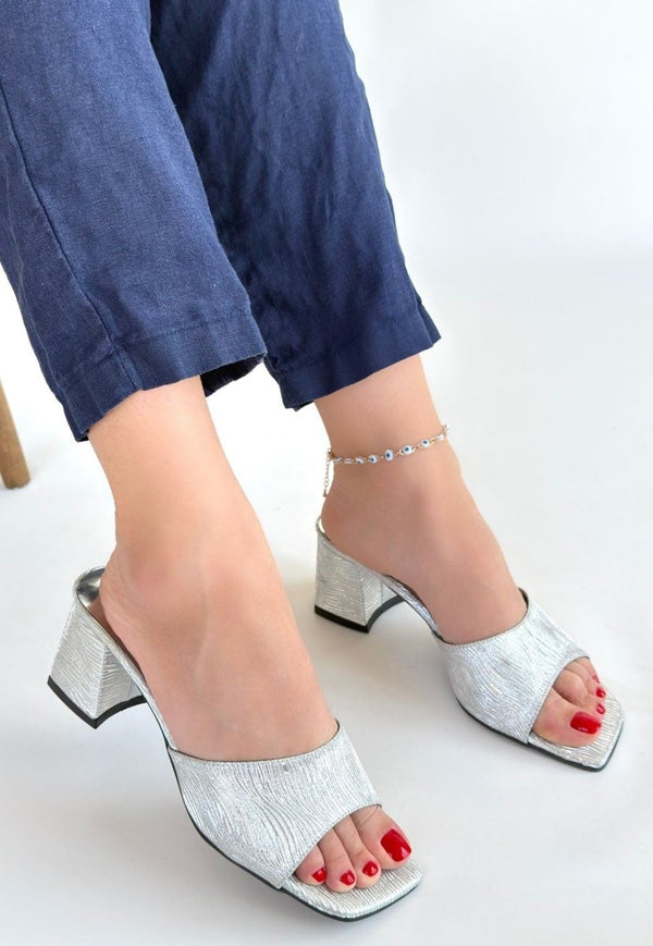 Scarpax Luart Gümüş Simli Kadın Topuklu Terlik - 7 cm Topuk, Cilt Malzeme, Rahat İç Taban