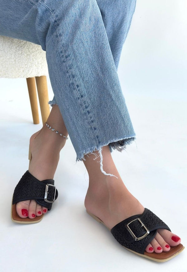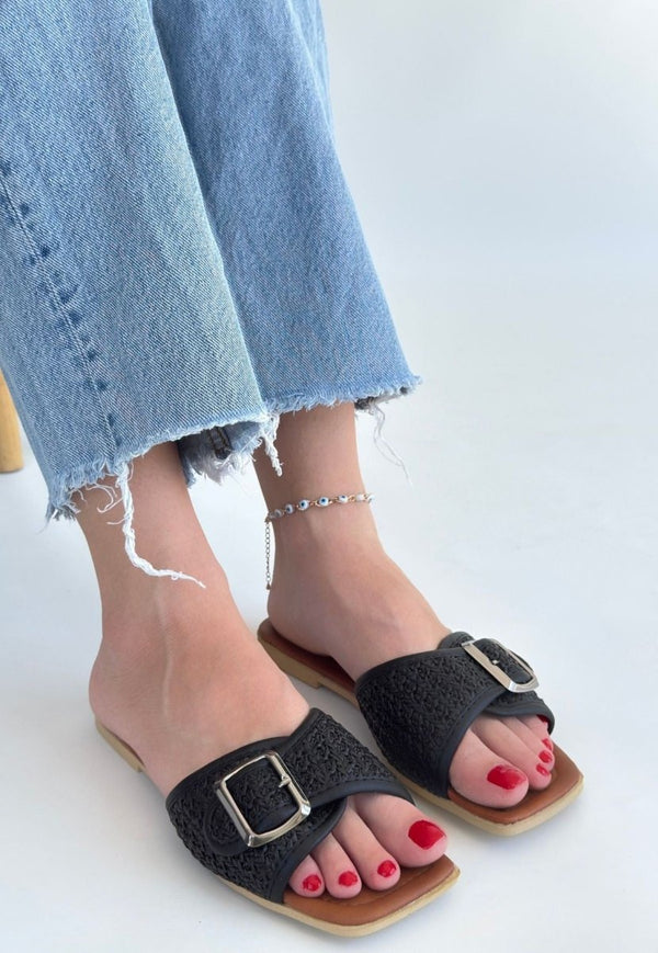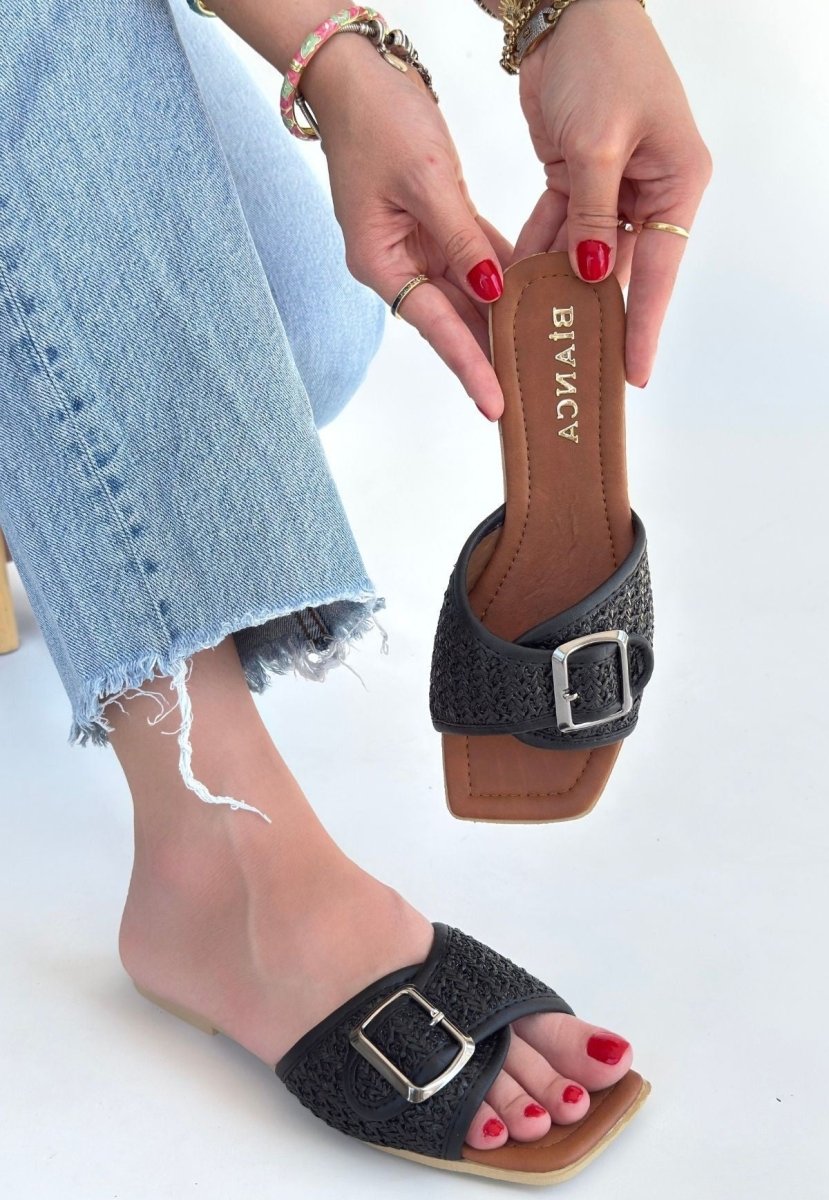 Renk olarak siyah, her tarzda kıyafetle uyum sağlar. Sade ama şık detaylar sayesinde, modern bir görünüm elde etmek isteyenler için ideal. Bu terliğin en dikkat çekici özelliği, pratik olanaklar olanakları tokalı tasarımıdır. Böylece ayaklarınızı sarartır ve rahat bir deneyim sunar.