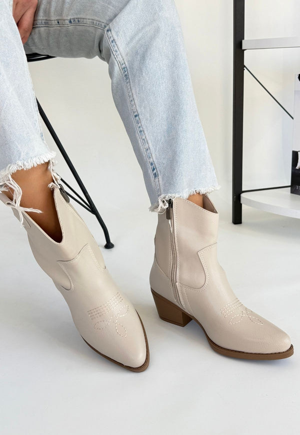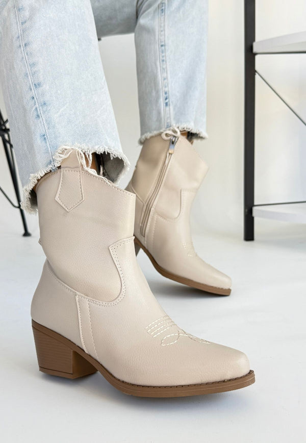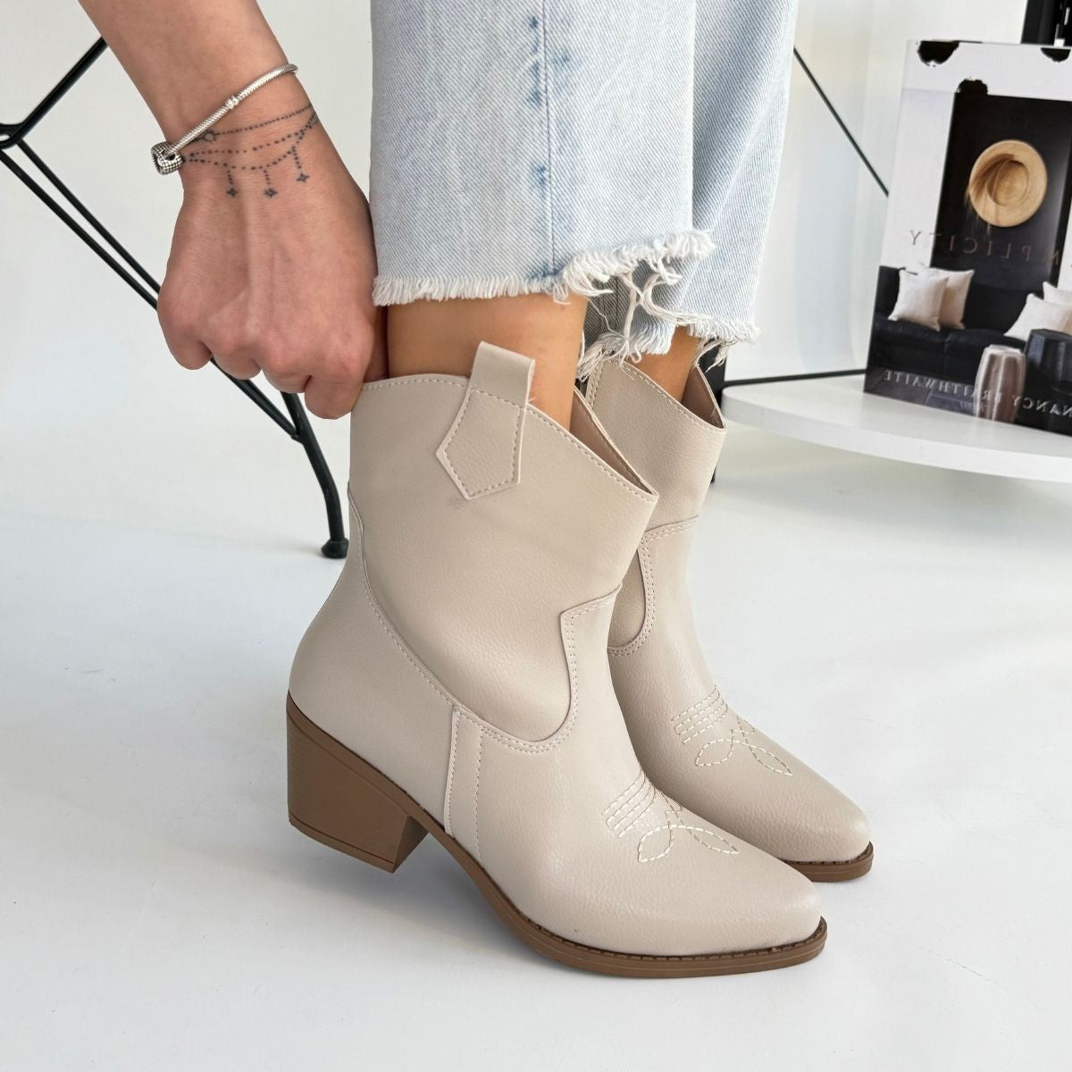 Yüksek kaliteli cilt malzemesi ile üretilmiş bu bej bot, 5,5 cm topuk genişliği sayesinde hem rahatlık sağlıyor hem de göz alıcıya bir görünüm kazandırıyor. Ayaklarınızı konforlu bir şekilde destekleyerek uzun saatler boyunca rahatlık hissetmenizi sağlar.