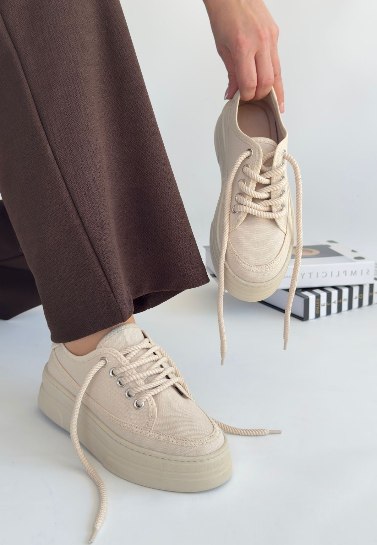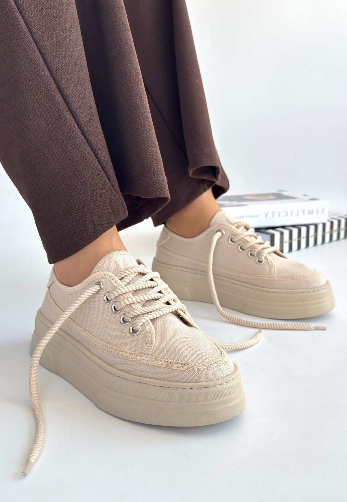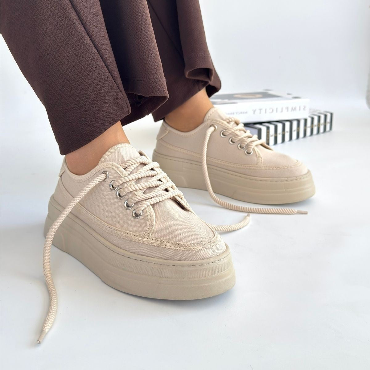 Scarpax Bej Keten Bağcıklı Spor Ayakkabı - Ortapedik 4Cm Topuk, Faylon Taban