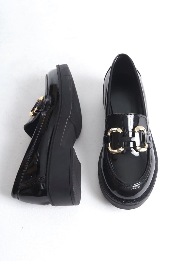 Scarpax Kadın Loafer - Caro Rugan Siyah Gold Tokalı Şık Günlük Ayakkabı