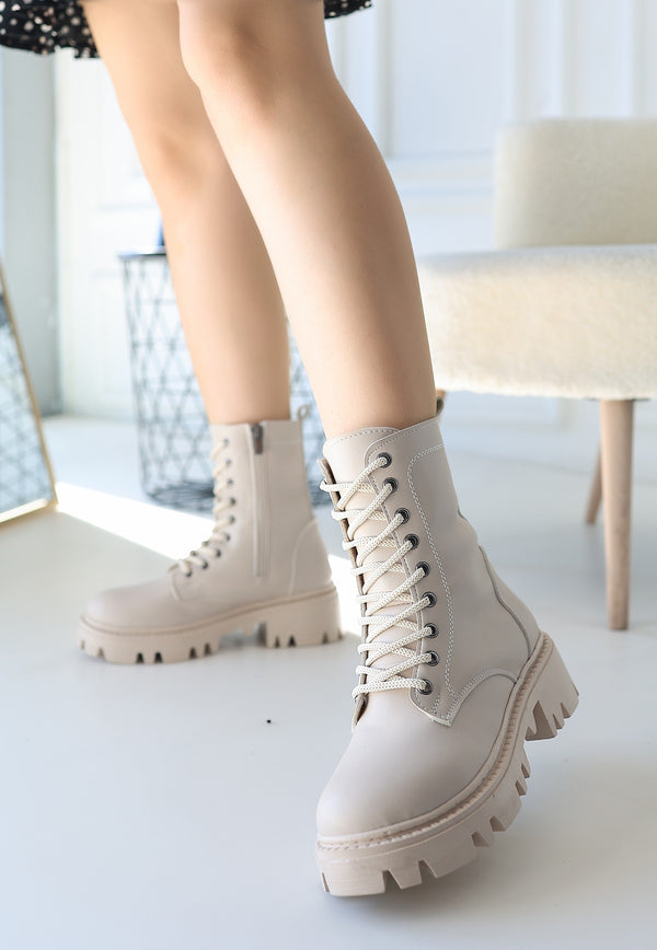 Scarpax Bej Cilt Yandan Fermuarlı Topuklu Bot - 5 cm Topuk, Standart Kalıp