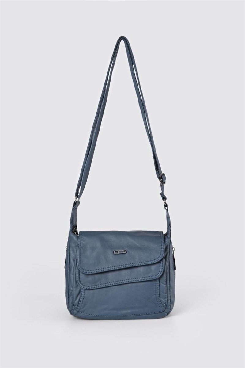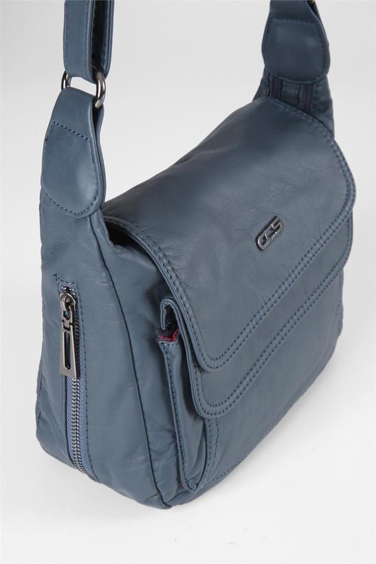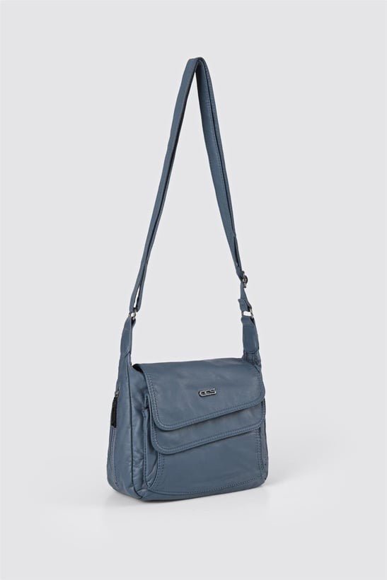 Scarpax Jelli Mavi Yıkama Deri Kadın Omuz Çantası 24x18x10 cm, Çoklu Fermuarlı Cepler