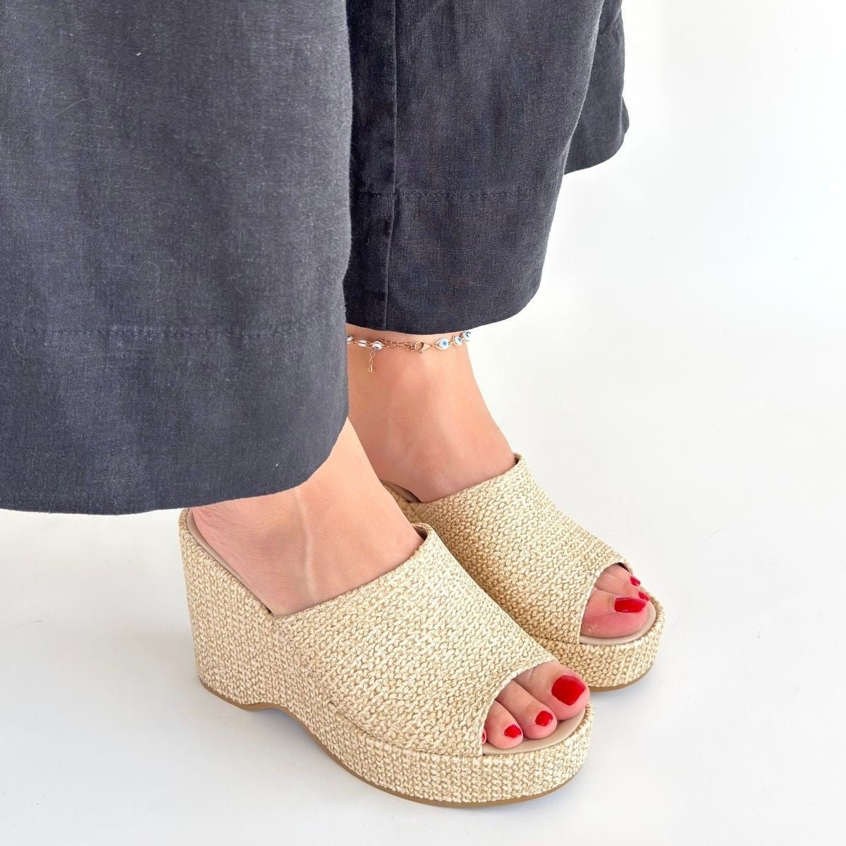 Scarpax Tlay Bej Hasır Dokumalı Dolgu Topuk Terlik