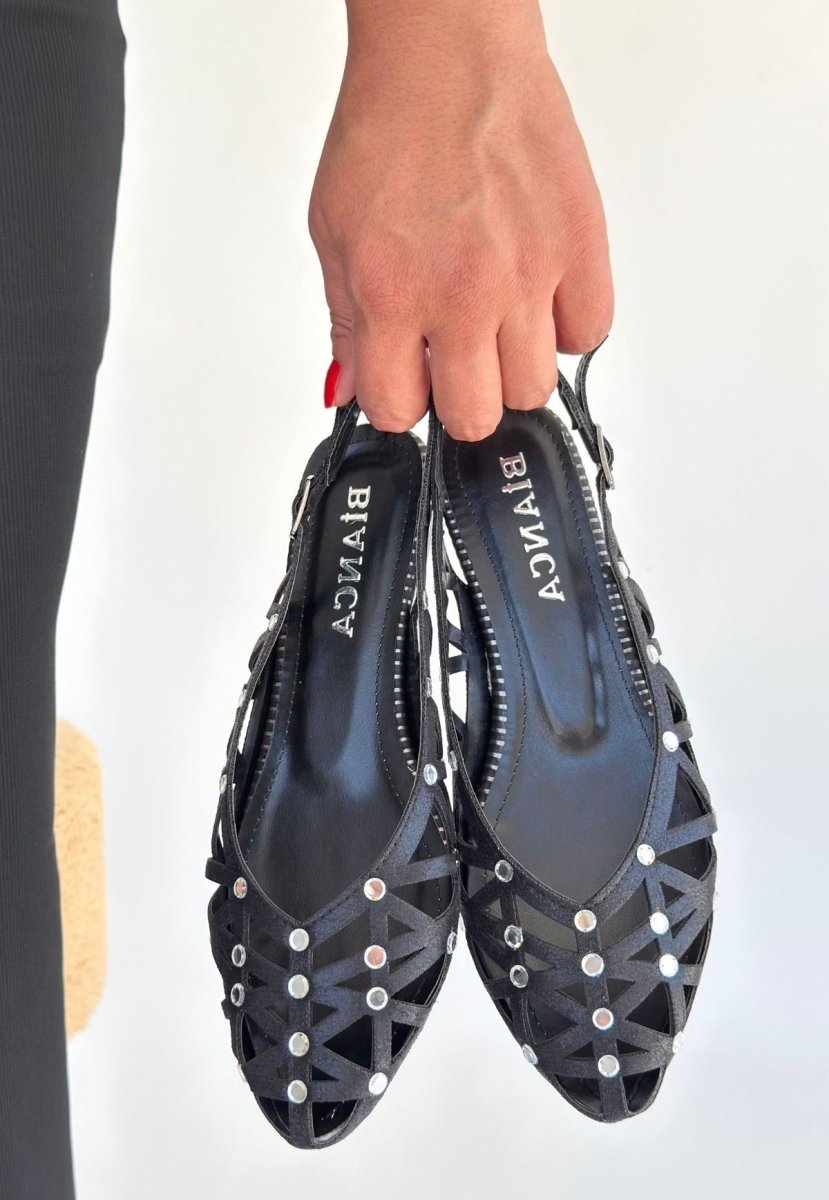 Scarpax Faty Siyah Cilt Boncuk İşlemeli Babet Ayakkabı - 1 cm Topuklu PVC Taban