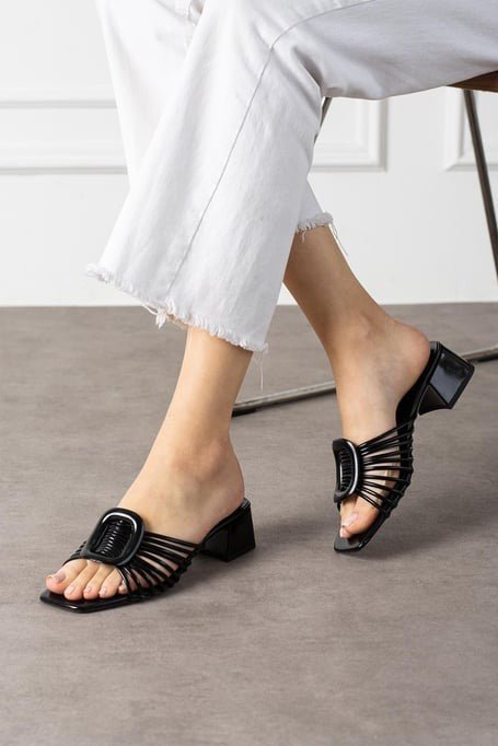 Modern bir görünüm için siyah renk, tüm kıyafetlerinizle harika bir uyum sağlar. Rugan malzemesi ile üst düzey bir estetik sunarken, dayanıklılığıyla da dikkat çeker. 4 cm'lik konforlu topuk boyu, gün boyu rahat hissetmenizi ve şık görünmenizi sağlar. Bu terliği ofiste, akşam yemeklerinde veya özel davetlerde güvenle kullanabilirsiniz.