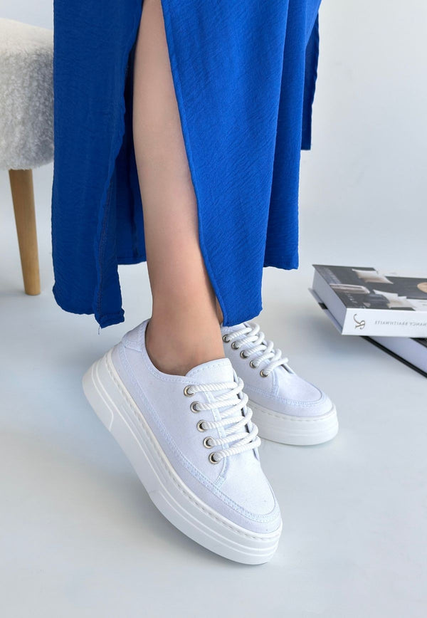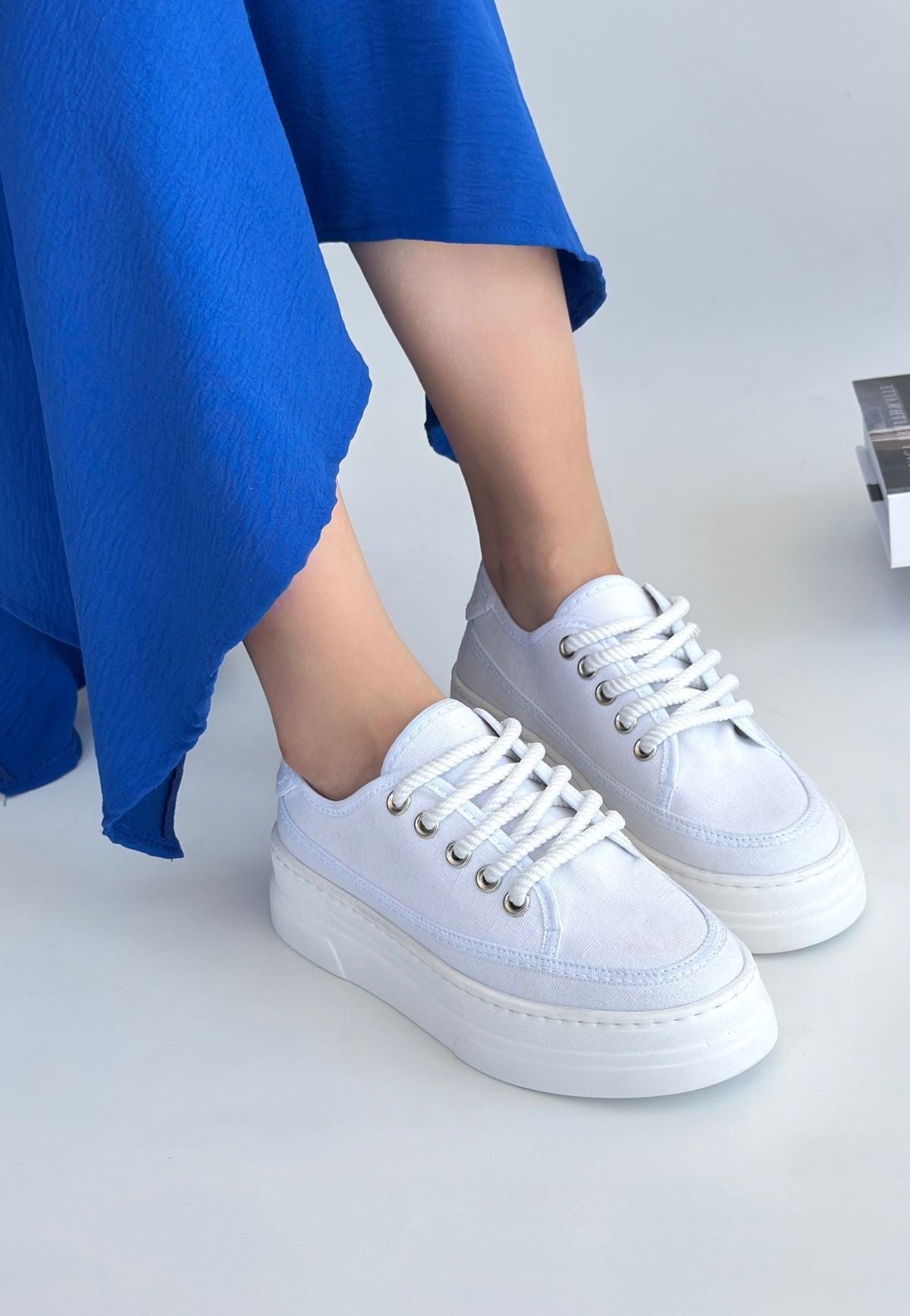 Scarpax Beyaz Keten Bağcıklı Spor Ayakkabı - Ortapedik Topuk Dikenine Özel Üretim, 4 Cm Topuk