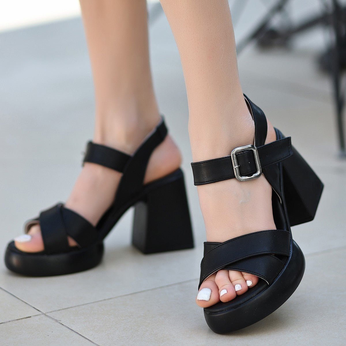 Scarpax Jaina Siyah Cilt Topuklu Sandalet - 9 Cm Kemerli Topuk, Poliüretan Taban