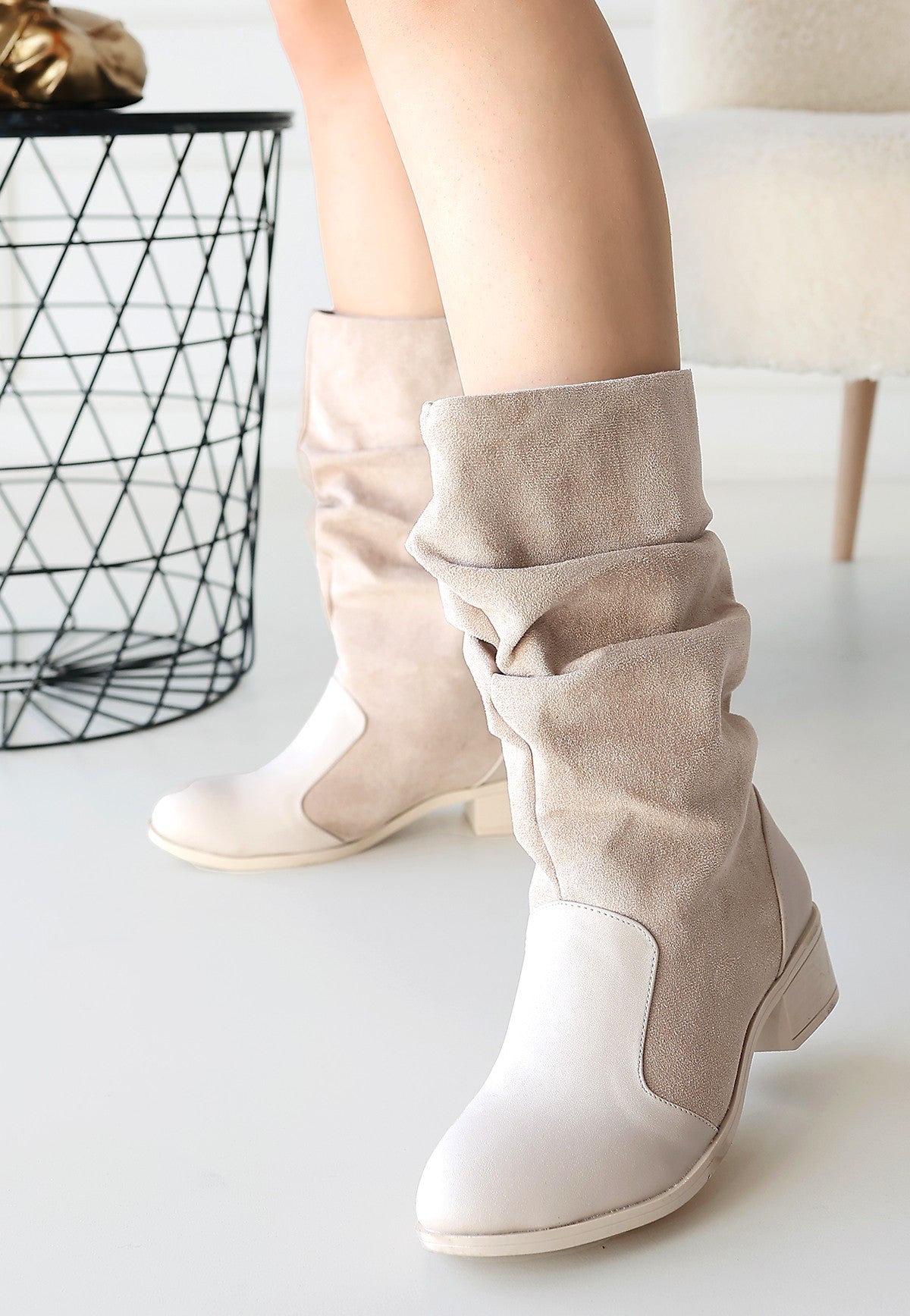 - Şık bej rengi ve süet detayları ile dikkat çekin.