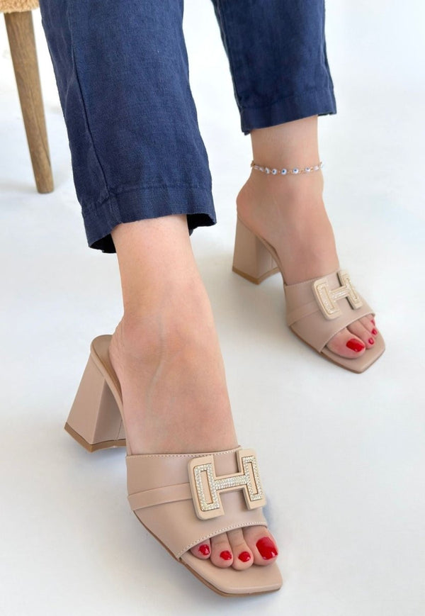 Bu topuklu terlik, premium kalitede cilt malzemeden üretilmiştir. Dayanıklı ve hafif yapısıyla, gün boyu konfor sunar. Bej rengi, her türlü kıyafetle kolayca kombinlenebilir. İster günlük bir yürüyüşte, ister özel bir davette rahatça kullanabilirsiniz.