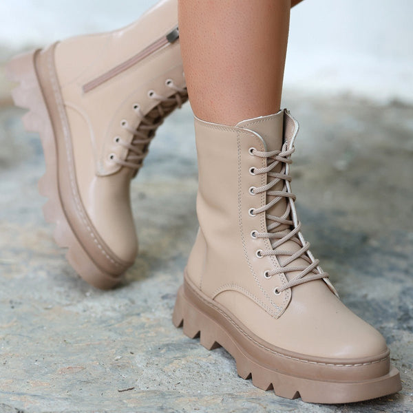Bu bot, zarif nude rengi ile modern bir tarza sahip. Yüksek kaliteli malzemeler kullanılarak üretilmiştir, böylece hem estetik hem de dayanıklılık sunar. Topuklu yapısı sayesinde günlük giyimde bile rahatlıkla tercih edebilirsiniz.