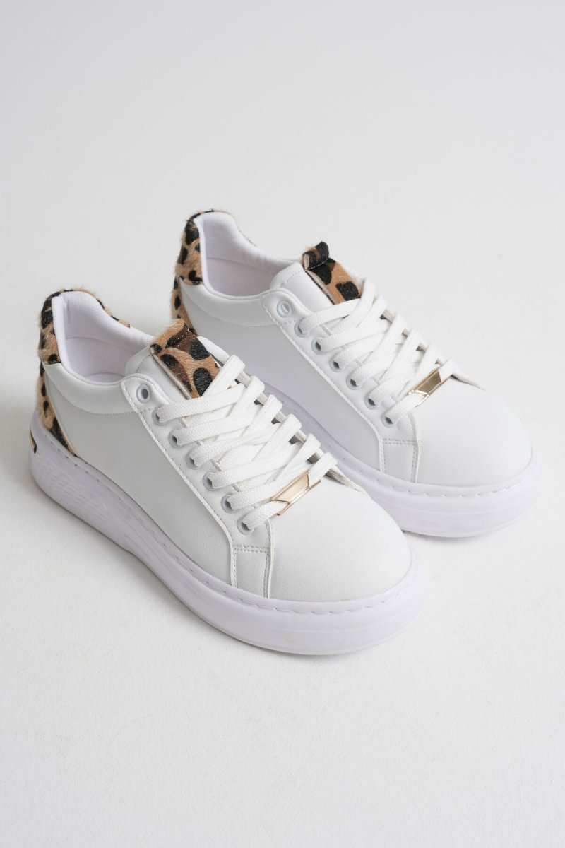 Bu spor ayakkabının dikkat çeken leopar detayları, sıradanlıktan uzaklaşmanızı sağlayarak dikkatleri üzerinize çekmenizi sağlar. Beyaz rengi ile kolay kombinlenebilir ve her türlü görünümünüze taze bir hava katar.