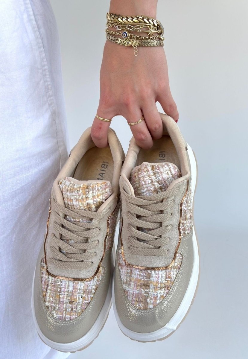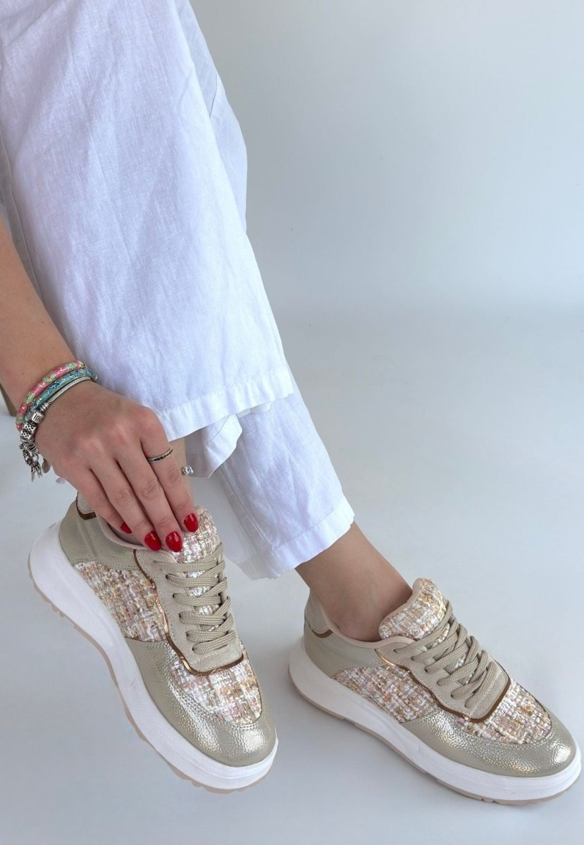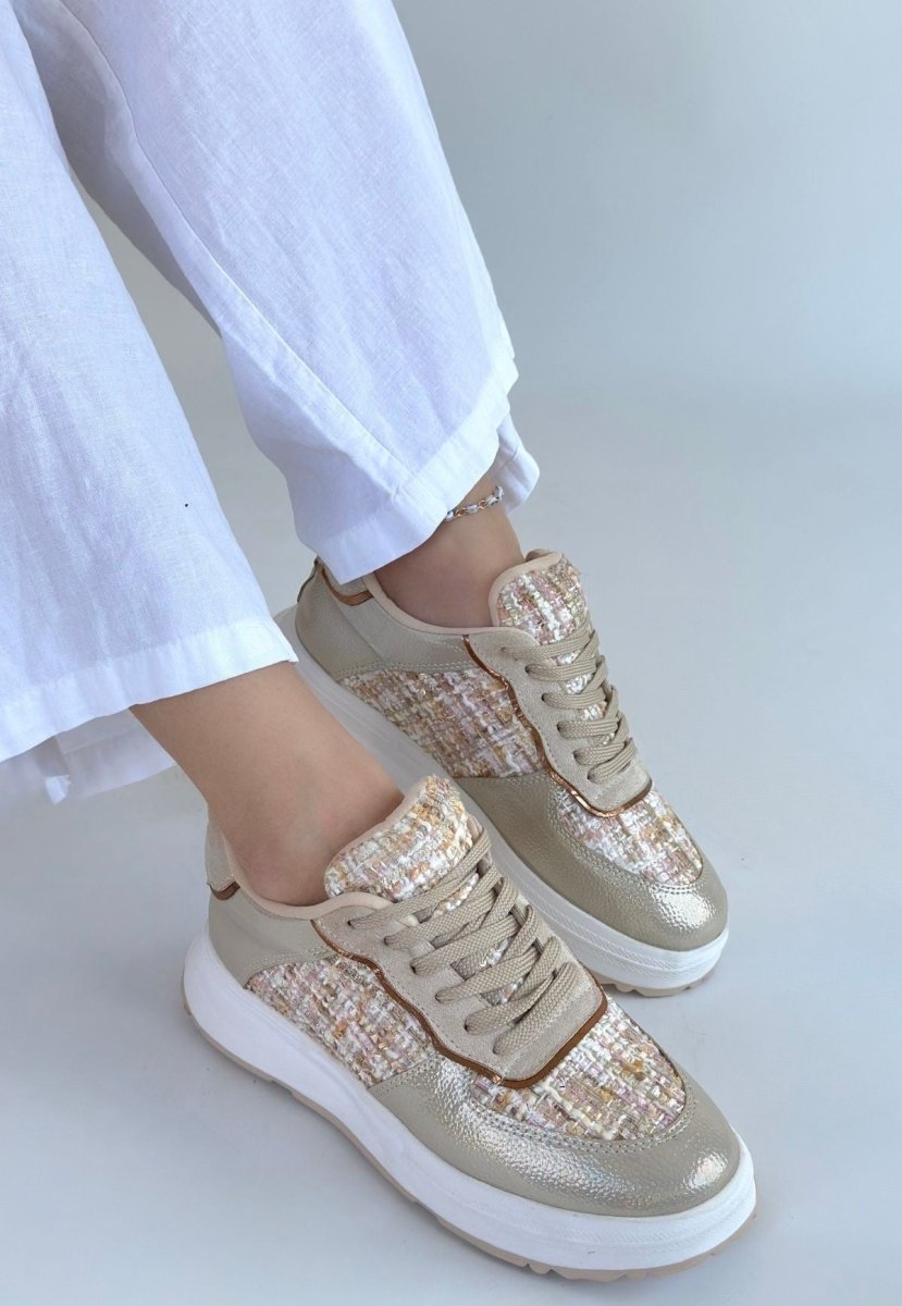 Scarpax Bej Cilt Bağcıklı Spor Ayakkabı - Leopar Detaylı Ortopedik 3 cm Topuk