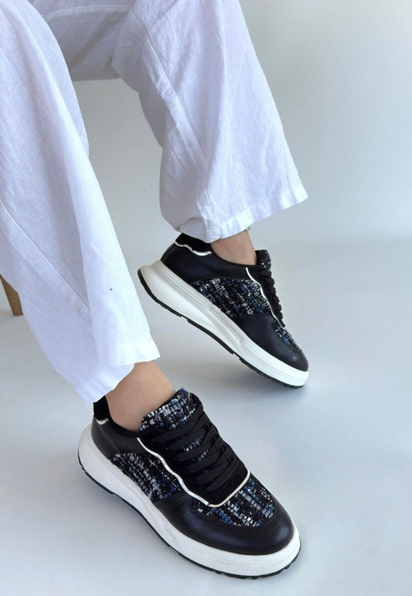 Scarpax Hawer Siyah Cilt Bağcıklı Spor Ayakkabı - Ortapedik Leopar Detaylı, 3 Cm Topuk