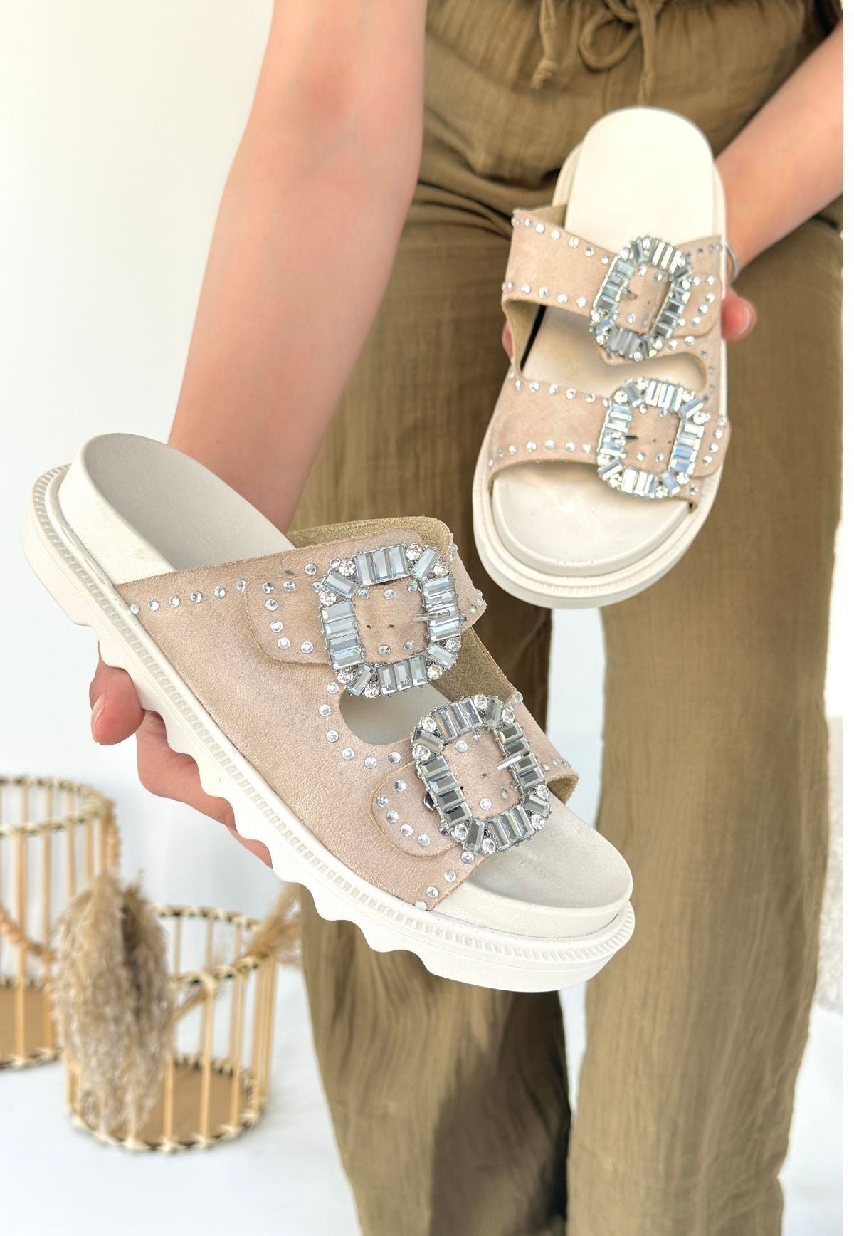 Scarpax Bej Nubuk Taşlı Terlik - Kemerli, 3 cm Topuk, Eva Taban, Standart Kalıp