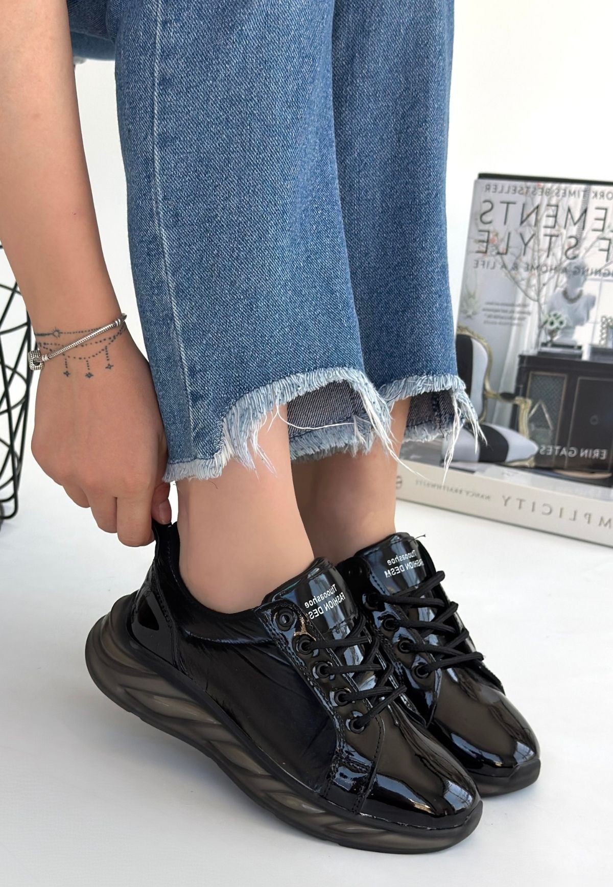 Scarpax Piona Siyah Rugan Gri Tabanlı Spor Ayakkabı, şıklığı ve konforu bir arada sunan özel bir spor ayakkabıdır. Siyah rengi ile her türlü kıyafetle uyum sağlar. Rugan malzeme kullanımı, ayakkabının hem şık görünümünü hem de yoğunluğunu arttırır.