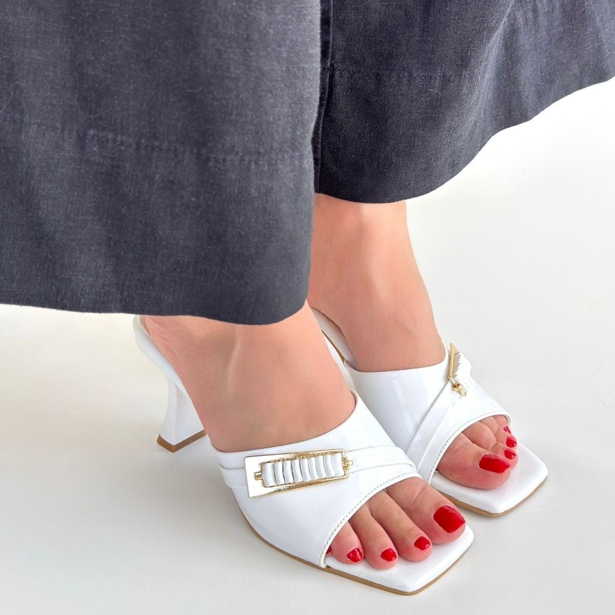 Şıklığı ve konforu bir arada sunan Scarpax Sief Beyaz Rugan Topuklu Terlik, onun kadının dolabında kadınlarında olması gereken bir parçadır. Modern tasarımı ve zarif duruşu ile dikkat çekerken, yüksek topuk sayesinde gizli bir zarafet sunar.