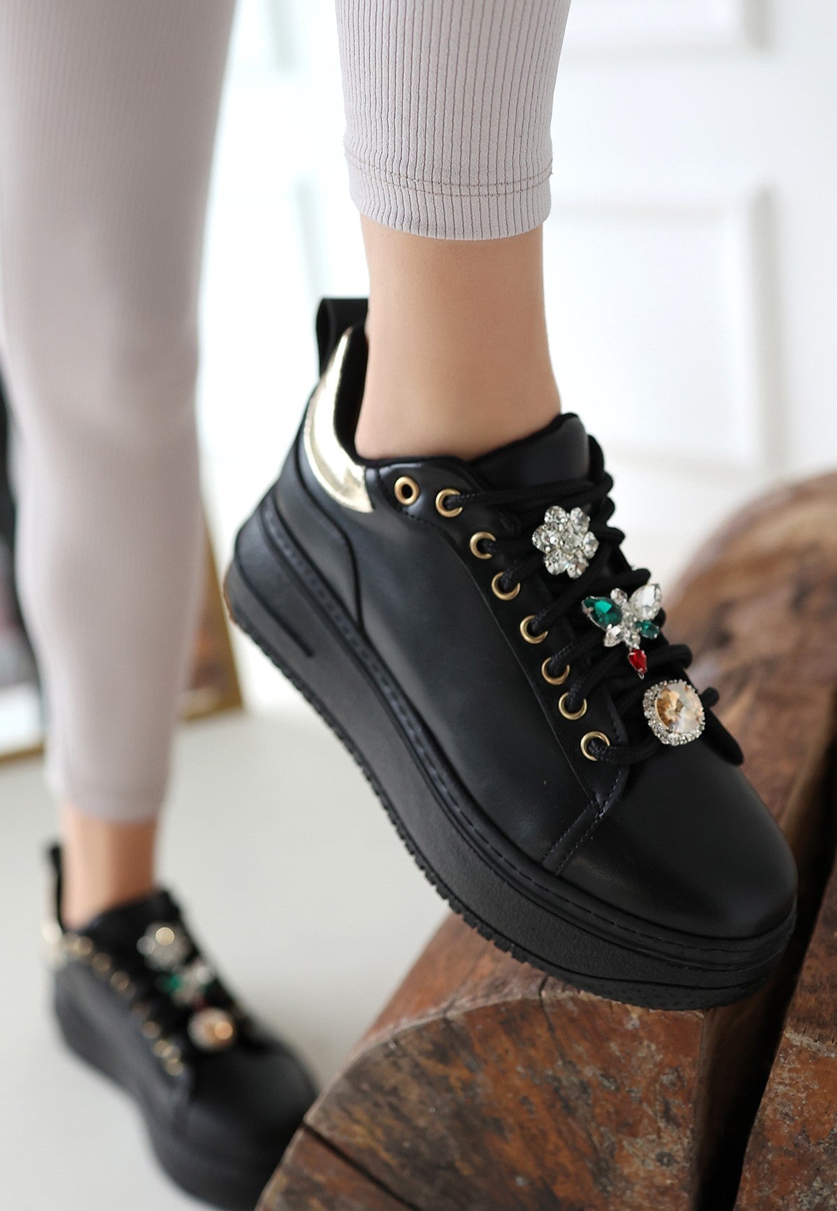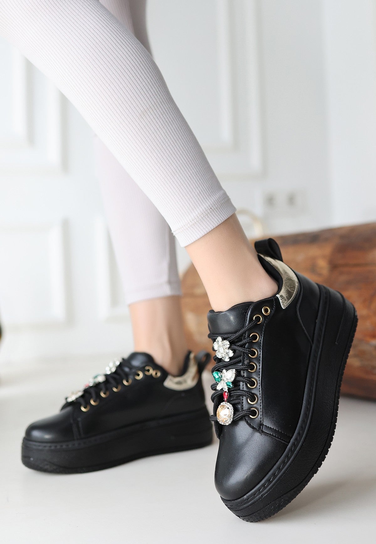 Scarpax Tenya Siyah Cilt Taşlı Bağcıklı Spor Ayakkabı