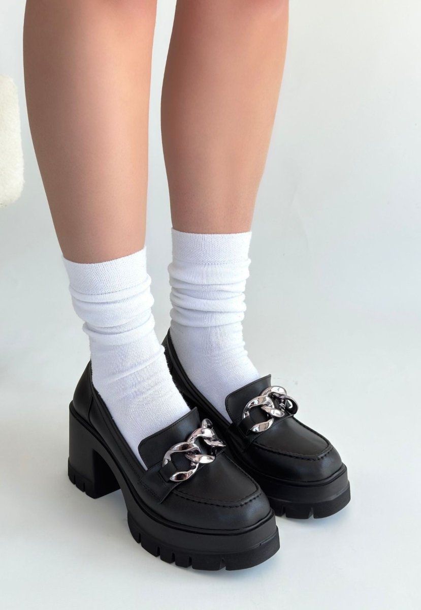 Bu zarif ayakkabı, siyah deri malzemenin şıklığını arttırırken, 8,5 cm'lik dolgulu dolgu topuğu ile rahat bir kullanım sunuyor. Rahat bir yürüyüş sağlamak için özel olarak tasarlanmış poliüretan taban malzemesi, hafifliği ve hafifliği ile gün boyu destekleyebilirsiniz. Platform mıknatıslı 4 cm olan bu model, hem estetik hem de işlevsel bir yapıdadır.